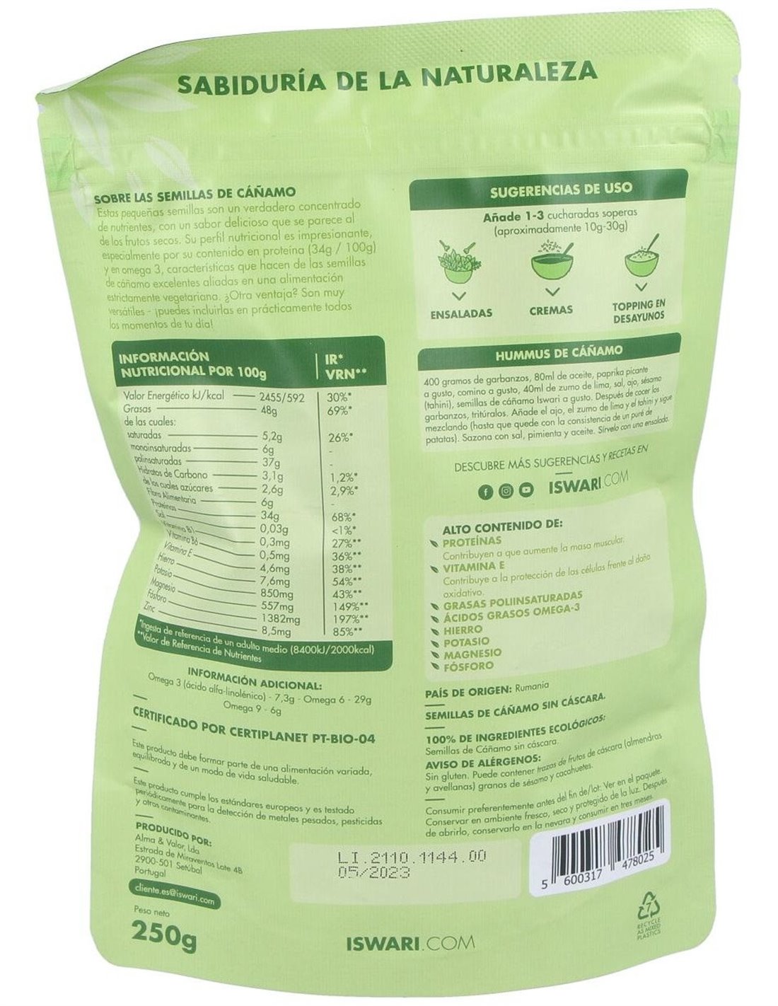 Semillas Cáñamo Sin Cascara Bio 250G Es 250G de Iswari